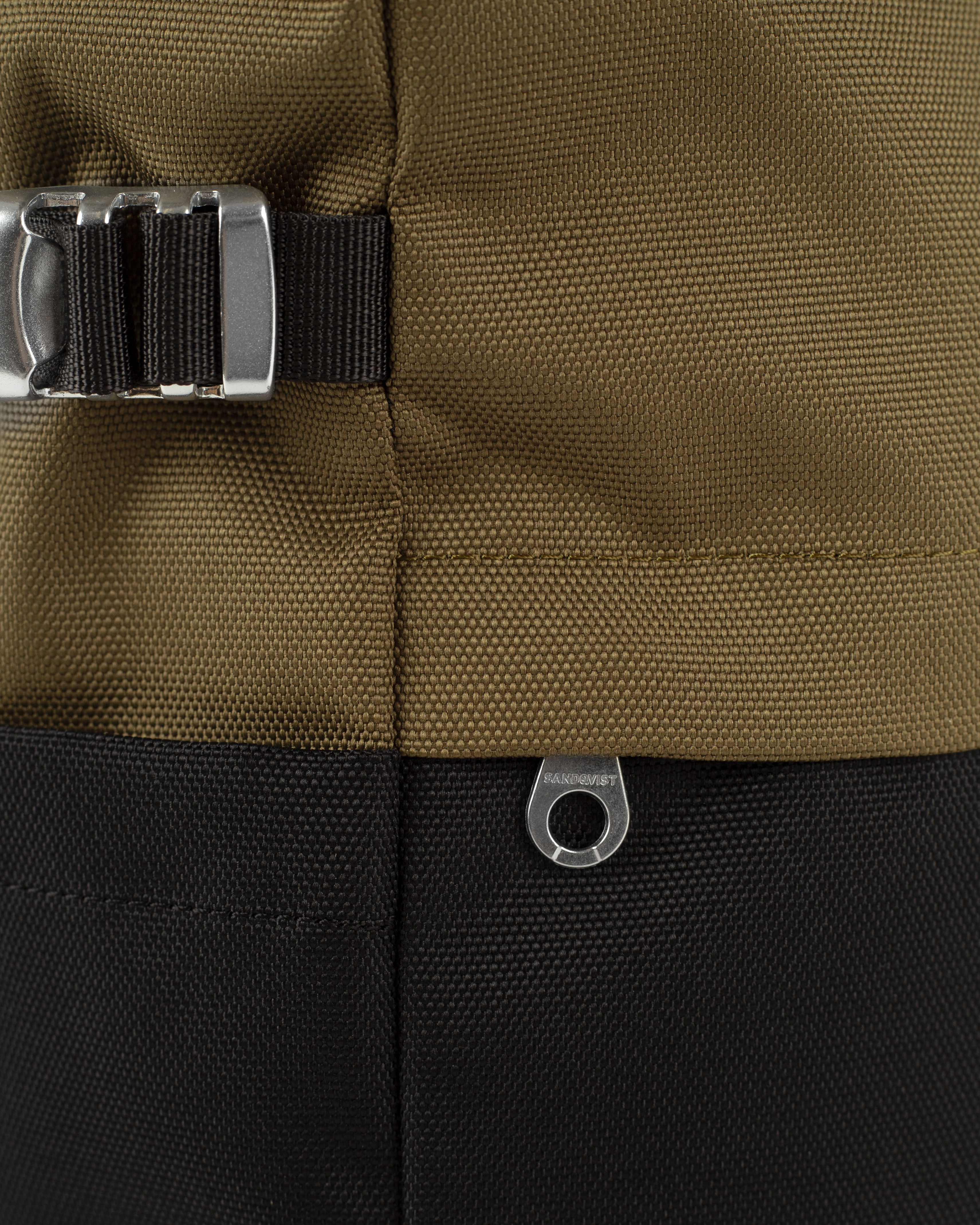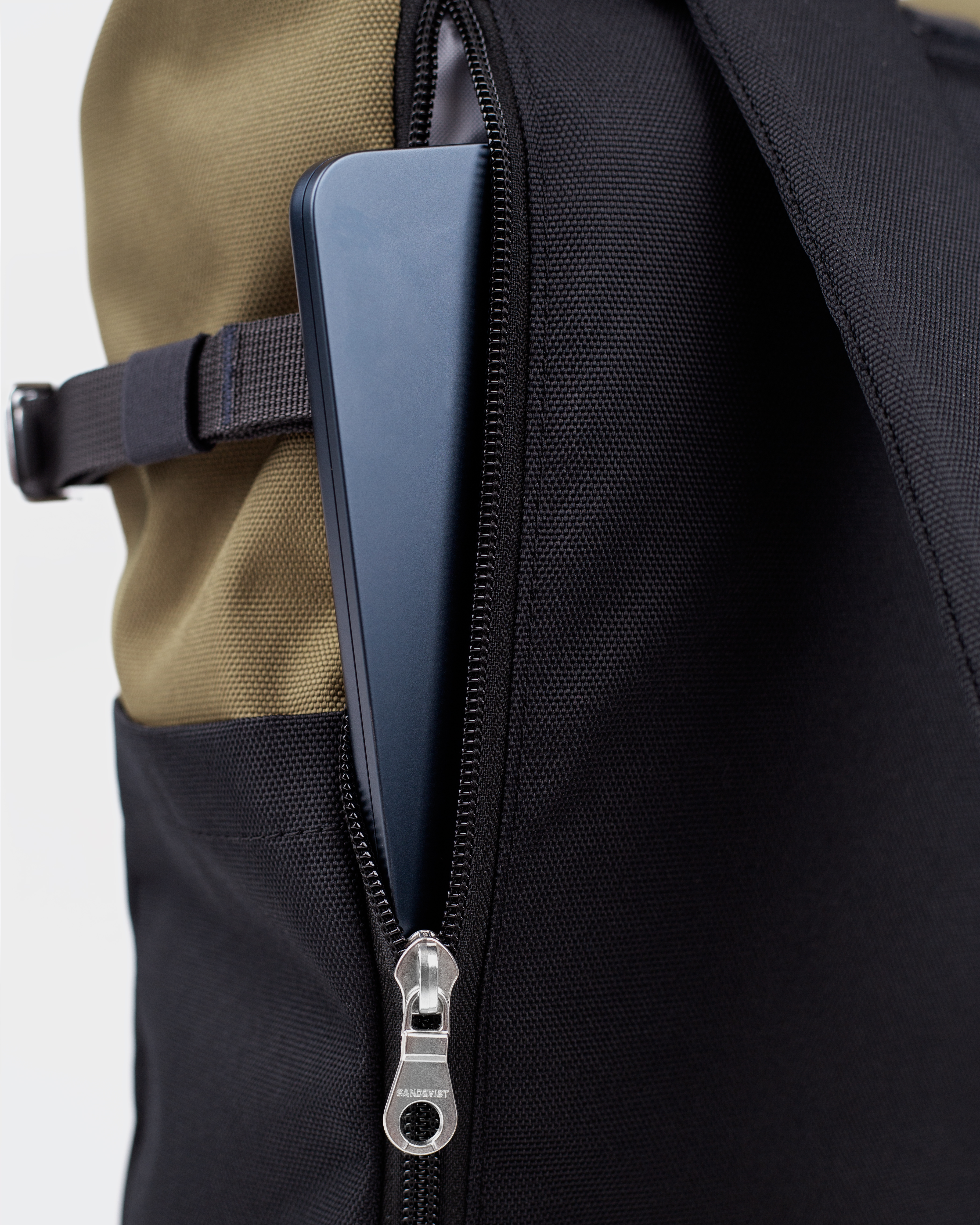 Fermeture à enroulement avec fermeture éclair, sécurisée par une boucle métallique.