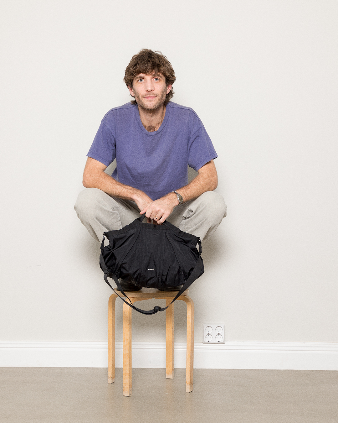 Male model wearing the Sandqvist Leather Suede Shopper Bag, taupe. Front view, wearing the bag on one shoulder.