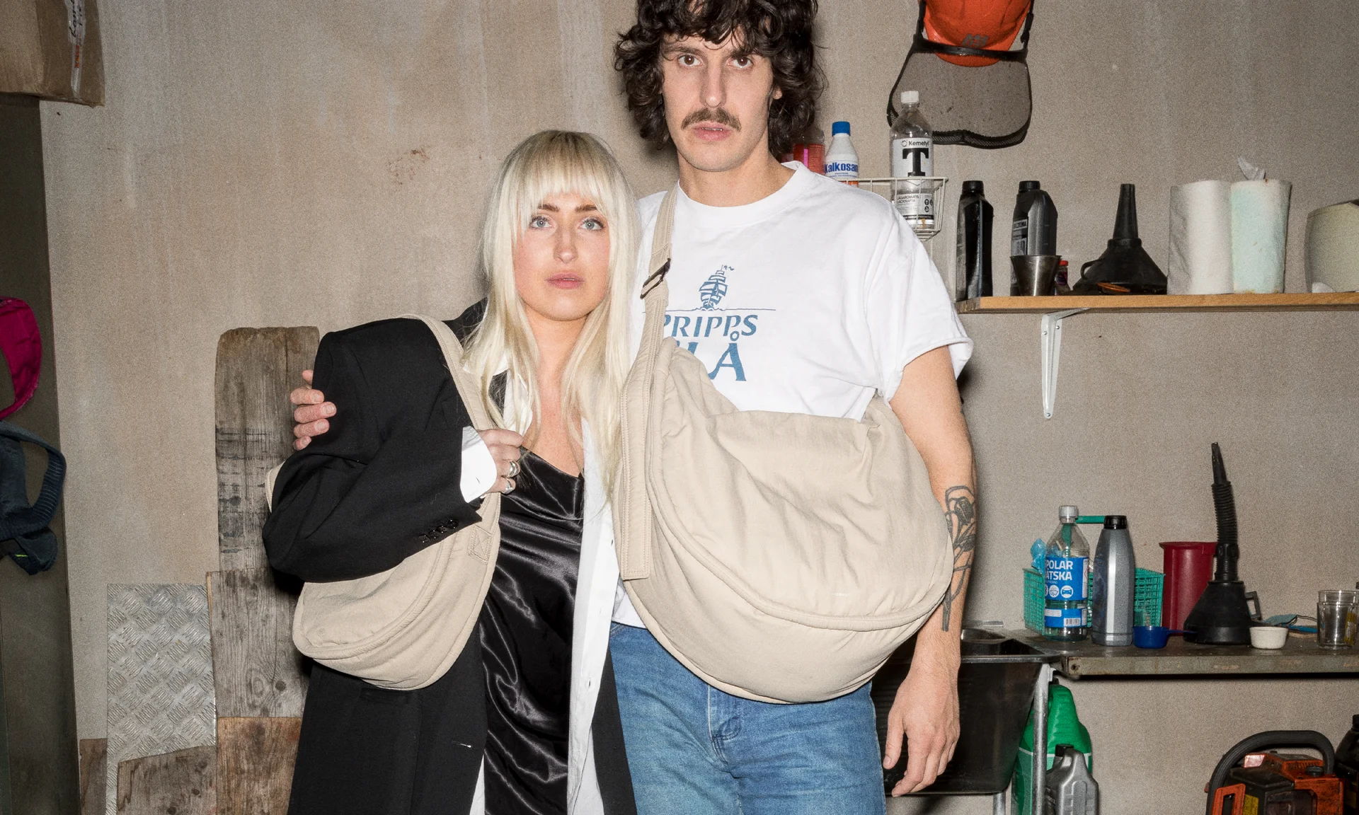 Male model standing behind a female model. The male model is wearing the Sandqvist Leather Shopper Bag, dark brown. The female model is holding the Sandqvist Leather Suede Shopper Bag, taupe.