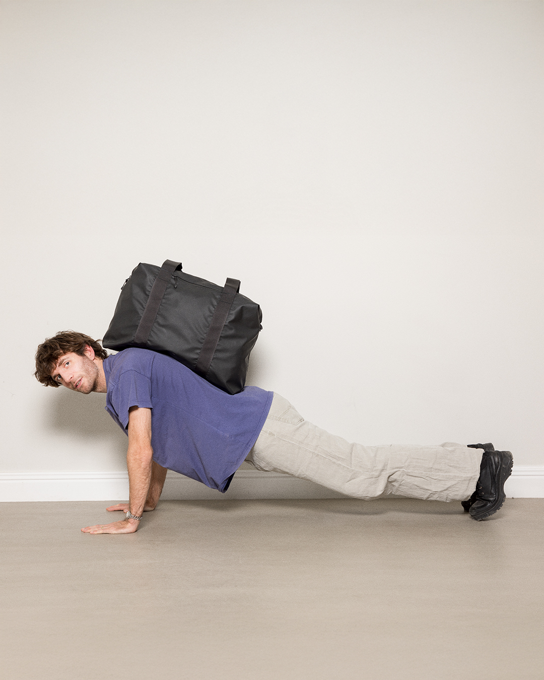 Male model wearing Sandqvist GO Weekender L, black. Side view, wearing the bag on one shoulder crossbody.Sandqvist GO Weekender L, black. Front view, front pocket with zipper and handles.