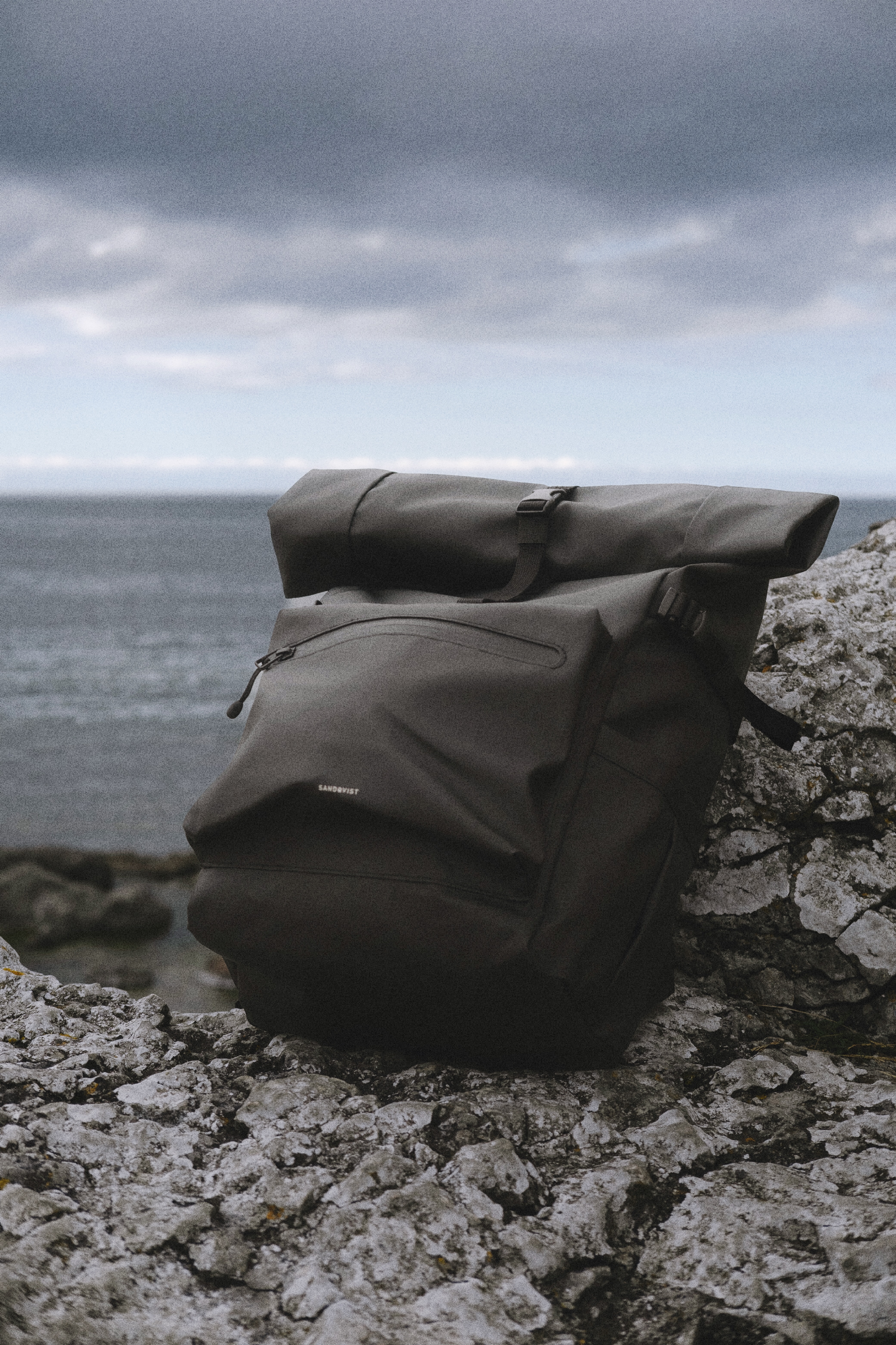 Sandqvist STREAM Rolltop backpack L in black, front view with zipper pocket, top handle, side straps and rolltop closure.