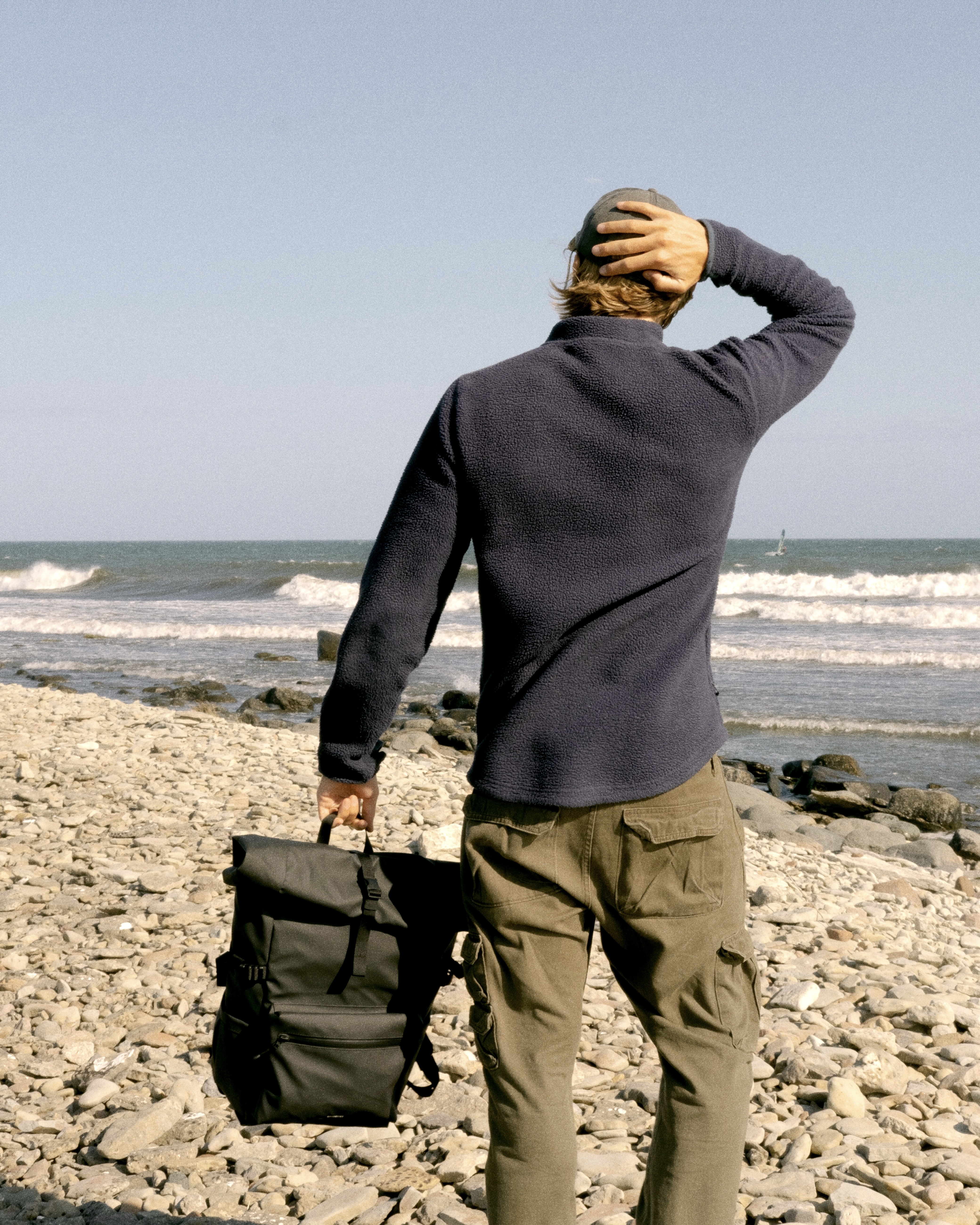 Male model carrying the backpack STREAM Rolltop Backpack L, Black, back view showing fit and size.