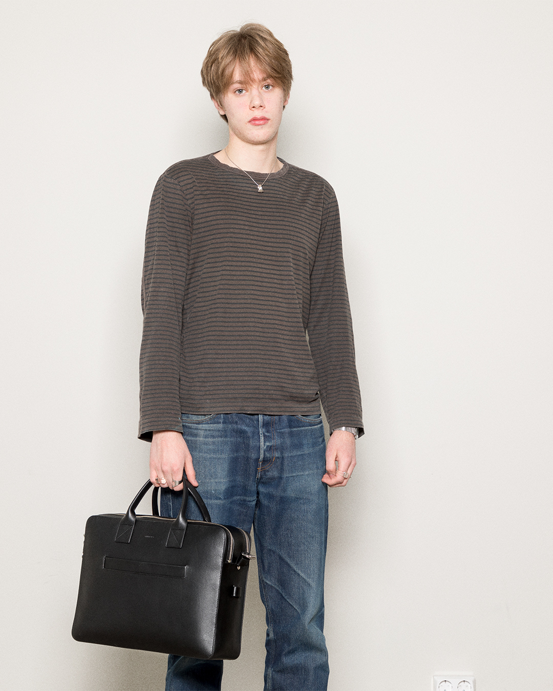 En tidlös portfölj i skandinaviskt läder. Klassisk siluett, många fack och datorfack för enheter upp till 16 tum.