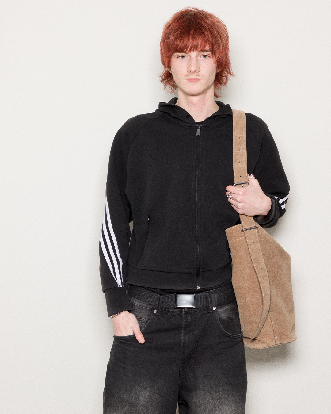 Tillverkad i högkvalitativ mocka med en mjuk, matt yta och subtila metalldetaljer.