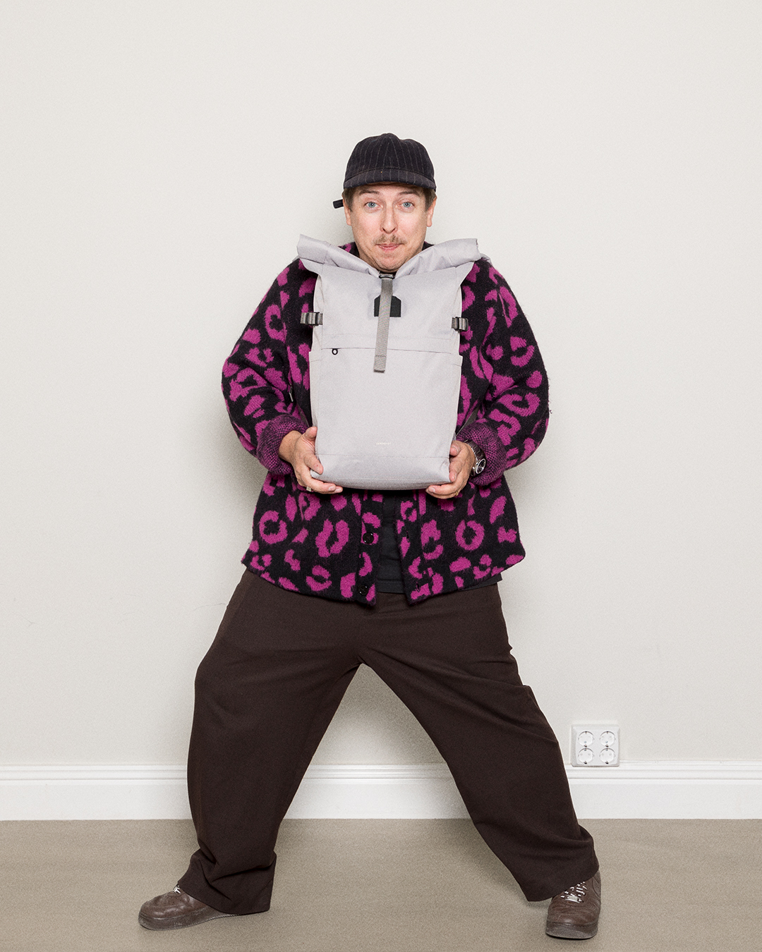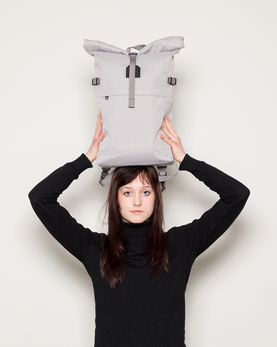 Male model wearing the Sandqvist Icon Rolltop Backpack 14", light grey. Front view wearing the bag in the front.